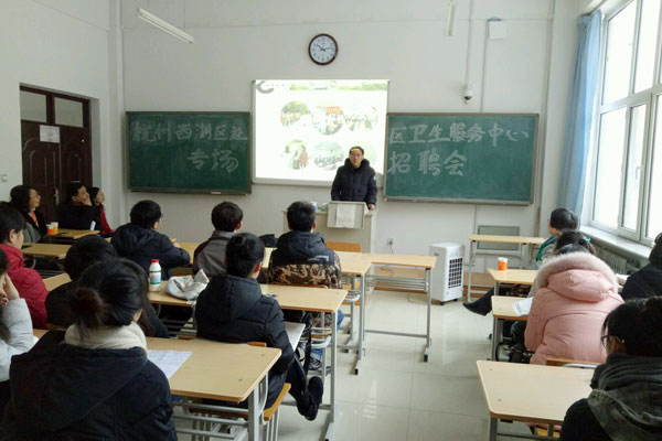 12月26日,公共卫生学院为2017届毕业生举办了专场招聘会,杭州市西湖区社区卫生服务中心主任韩树利向毕业生介绍了招聘单位情况,并与学生进行了现场交流。2名预防医学专业学生与用人单位达成就业意向。