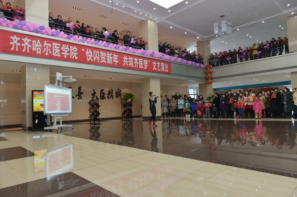 12月30日下午,学院图书馆二楼大厅张灯结彩、热闹非凡,充满了辞旧迎新的喜庆气氛。由学院工会主办、图书馆协办的“快闪贺新年 共筑齐医梦”文艺演出在这里隆重举行。学院党委书记邱福利、院长刘吉成、副院长王晓星、张晓杰、纪委书记毕红霞、工会主席何宪坤亲临现场与全院1000余名师生共同观看演出。