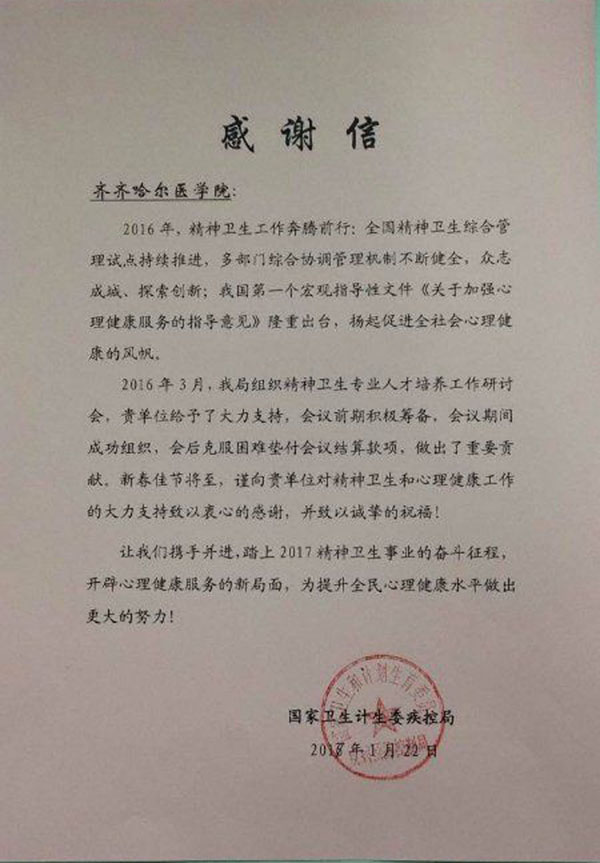值此农历新年之际,国家卫生计生委向学院发来感谢信,对学院在2016年承办的第二届“全国精神卫生专业人才培养工作研讨会”,以及学院多年来在全国精神卫生工作中的巨大贡献表示感谢。