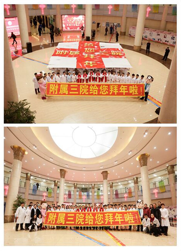 活动当天,医院医护人员首先以时下流行的“快闪”形式,串接了《seve》、《ppap》、《小鸡小鸡》的舞曲表演。表演者都是医院年轻的医生、护士,他们戴着可爱的头饰,脸上洋溢着青春的笑容,舞蹈动作卖力到位,大厅的部分患者也随着表演者一起律动,享受着健康快乐的节日氛围。歌曲结束后,表演者迅速退场。悠扬的小提琴声随即响起,伴着动听的乐声, 6位医护人员依次拿着麦克风,走向舞台,动情的演唱了一首《明天会更好》。大厅的氛围立刻由热烈转向温馨。同时,由护理部的护士组成的拼字方队步入大厅中央。歌曲结束,医院领导班子走到台前,以拼出的“附属三院给您拜年”几个大字为背景,共同向全院的患者、职工送上节日的祝愿。最后,活动伴随着礼花和欢呼声,在热烈的气氛中结束。