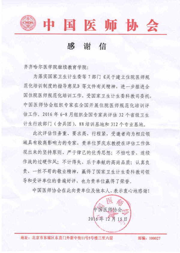近日,中国医师协会向学院发来感谢信,对学院在2016年住院医师规范化培训评估工作中的辛勤工作,以及对国家卫生计生委的支持表示感谢。