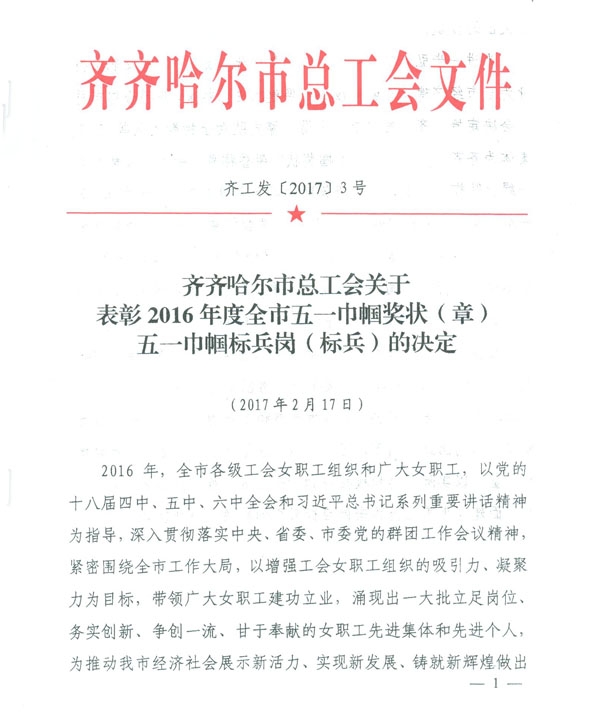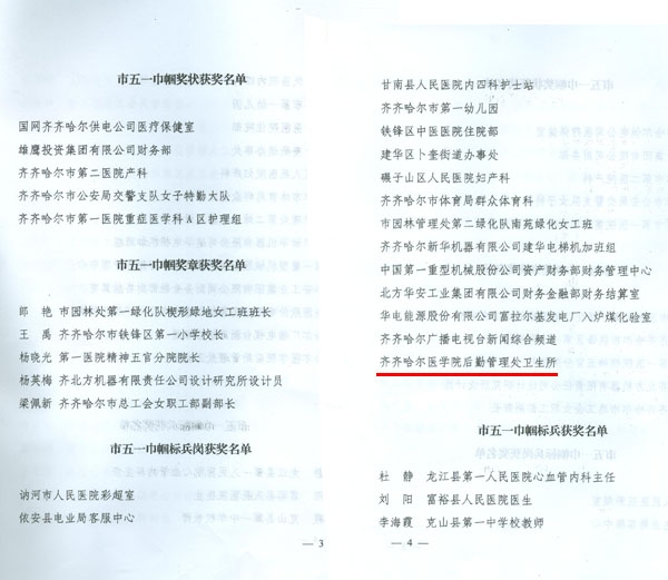 3月1日上午,在市总工会组织召开的关于表彰2016年度全市五一巾帼奖状(章)、五一巾帼标兵岗(标兵)大会上,学院卫生所荣获2016年度市五一巾帼标兵岗荣誉称号。