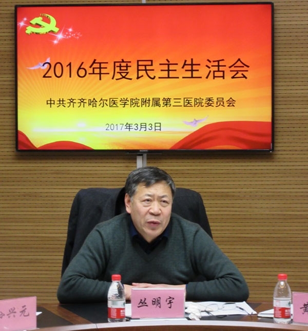 根据中共齐齐哈尔医学院委员会《关于召开2016年度民主生活会的通知》要求,3月3日,附属三院召开了领导班子2016年度民主生活会。学院副院长丛明宇莅临指导,附属三院党委书记黄海涛,党委委员孙兴元、宁景志、孙庆顺、武立刚、王莹参加会议,会议由附属三院党委书记黄海涛主持。
