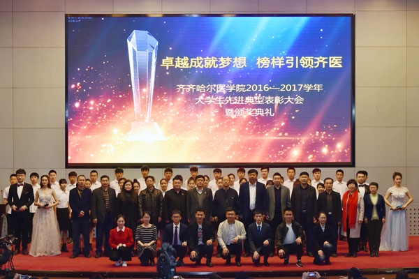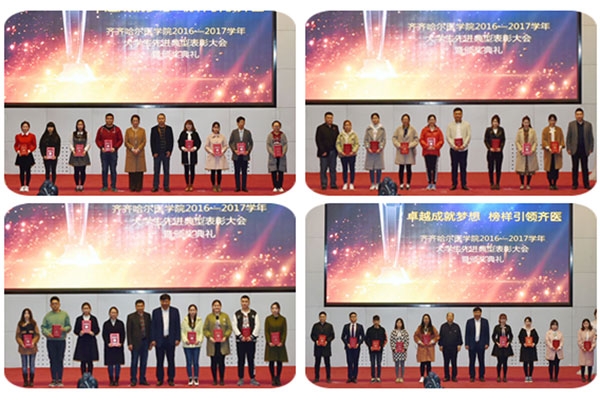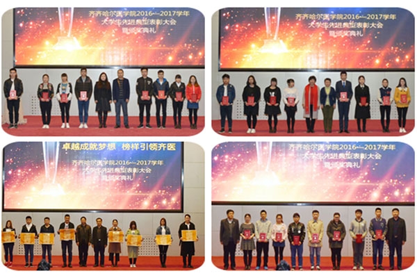大会对校 “勤助之星”、“勤助能手”,校“三好学生”、“优秀学生干部”,校“先进班集体”、“优良学风班”,校“优秀心理委员”,校“文明标兵寝室”、“文明寝室”,省“三好学生”,“国家奖学金”获得者,获得省级及以上奖励的1083个集体和个人进行了表彰奖励。获奖学生代表在接受主持人的采访时,讲述了各自在勤工俭学、寝室建设、学习科研、社会活动、班级建设和自立自强等方面的励志故事,表达了对学校和老师的感恩之情,并激励在场学生不断开拓进取、追求卓越。获得全国学生“学宪法,讲宪法”演讲比赛全国总决赛高校组二等奖的赵宇同学提到:他在演讲中将原本的“黑龙江省赵宇”,改成了“黑龙江省齐齐哈尔医学院赵宇”,他说“我只是想让其它院校看到我们学校的学生并不比所谓的‘985’‘211’的学生差。身为齐医学子,我们并不逊色。今日我以母校为荣,明日母校以我为荣。”他的发言引起了同学们的强烈共鸣,赢得了现场观众的热烈掌声。