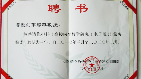 4月21-23日,《高校医学教学研究(电子版)》杂志编委会换届会议暨第二届编委会第一次工作会议在北京协和医院召开。会上选举产生了由25个省市52个高校人员组成的第二届编委会,学院李静平教授被聘为常务编委,聘期三年。