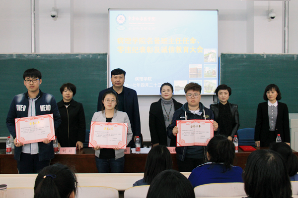 病理学院副院长刘婷宣读了《关于命名表彰2016-2017学年第一学期“零违纪班级”及班级所属零违纪个人的决定》,与会领导为受到表彰的班级颁发了荣誉证书。会上,病理学院辅导员孙艳宏老师以《诚信与大学生成才》为题,对学生进行了诚信教育,希望同学们向受表彰的班级和个人学习,进一步增强考试诚信意识,自觉杜绝考试作弊现象,积极争创零违纪班级。