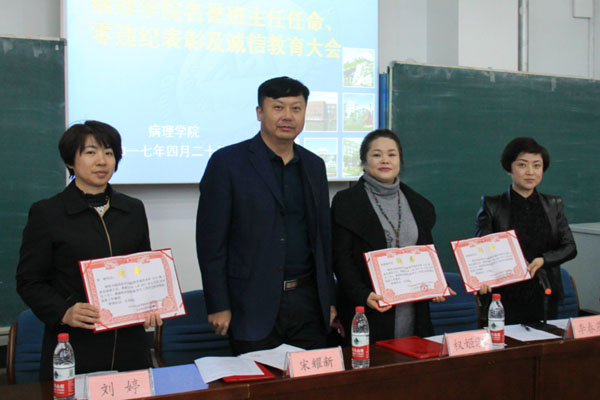 为密切病理学院师生联系,进一步培育优良学风,切实将“三导向”人才培养模式落到实处,4月25日,病理学院召开了“名誉班主任”任命、零违纪表彰及诚信教育大会。学生工作部部长宋耀新应邀出席会议,病理学院党政领导、辅导员及全体在校生参加了会议,会议由病理学院副院长李春燕同志主持。