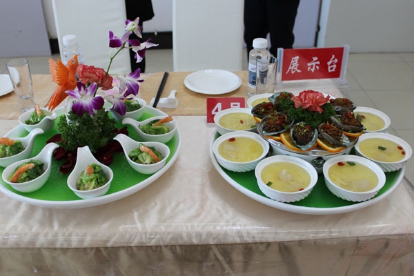 比赛分为主食、副食烹饪和打饭卡比赛3个环节。主食烹饪要求在规定时间内完成指定主食2样、创新主食2样,副食烹饪要求在规定时间内完成指定菜品3个、创新菜品2个,打饭卡比赛依据速度、准确率进行评比。5个学生食堂共选派了32名选手参加比赛,其余职工则为选手们鼓劲加油。经过一个半小时的角逐,各食堂选手们呈上了精心制作的“红粉佳仁”“荷塘月色”等色香味俱佳的美食作品,并简要介绍了作品制作过程。由后勤管理处处长、科长们组成的评委团对选手们的作品进行品尝,并从刀工、色、香、味、营养价值及创意等方面进行逐项打分。最终,学生一食堂荣获主食烹饪一等奖、学生二食堂荣获副食烹饪一等奖、学生五食堂荣获打饭卡比赛一等奖,后勤管理处处长徐辉和副处长倪伟芳为获奖选手颁发了奖品。