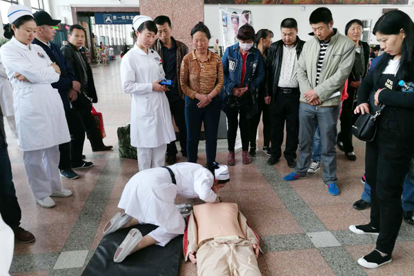 附属三院护理部将护士节活动与 “两学一做”学习教育有机结合,5月9日至11日,与齐齐哈尔铁路客运段、黑龙江交通职业学院、齐齐哈尔火车站联合开展了“护佑生命、守卫健康”护理义诊急救知识进基层培训系列活动。医院的两位护士长讲解和实践操作 “心肺复苏”急救技术,客运段列车安全员、红十字救护员、在校大学生、火车站过往旅客接受了培训。两位老师的讲解深入浅出,动作娴熟规范,回答提问耐心细致,赢得了学员的阵阵掌声。现场还有不少学员主动上台,在老师的指导下进行实际操作。大家一致认为此类贴合群众的实际需要,提高了市民的急救能力,使他们在遇到突发溺水、突发心脏骤停等情况时能更好的发挥作用。