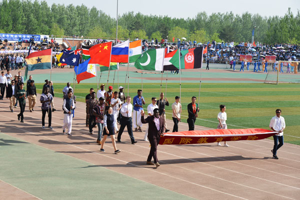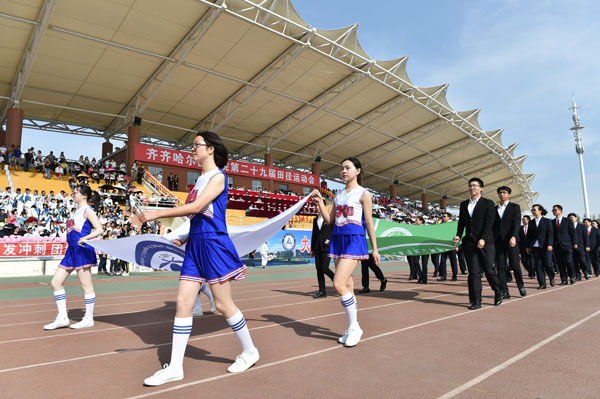 上午8时整,开幕式正式开始。在国旗护卫队的引领下,校旗、彩旗方队、裁判员队伍,以及院本部职工、各二级学院、国际教育学院、附属医院等20支代表队迎着朝阳,踏着整齐的步伐相继接受大会主席台检阅。各方队匠心独运、各具特色,靓丽的服装、饱满的精神彰显了齐医学子的飒爽英姿和独特个性。护理学院代表队别出心裁,向主席台观礼领导赠送了鲜花,以示敬意。