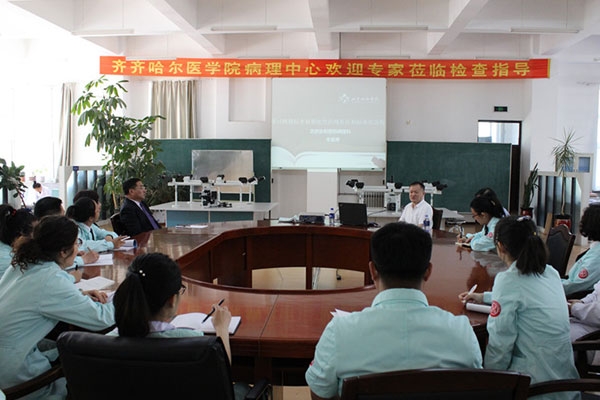 考察中,王德田老师介绍了专委会职能,他说,专委会接受政府主管部门的委托,组织开展病理装备相关的法规、规章、标准制定和政策性研究、战略研讨及政策咨询,还负责组织病理装备相关的继续教育培训等。李星奇老师围绕病理标本前期处理的规范化和标准化流程作了精彩讲座。临床病理诊断中心全体技术人员听取了讲座,并就工作中遇到的困惑和病理切片质量控制等问题与两位专家进行了交流和探讨。两位专家在考察过程中,对中心的硬件设施和综合实力给予了高度肯定。
