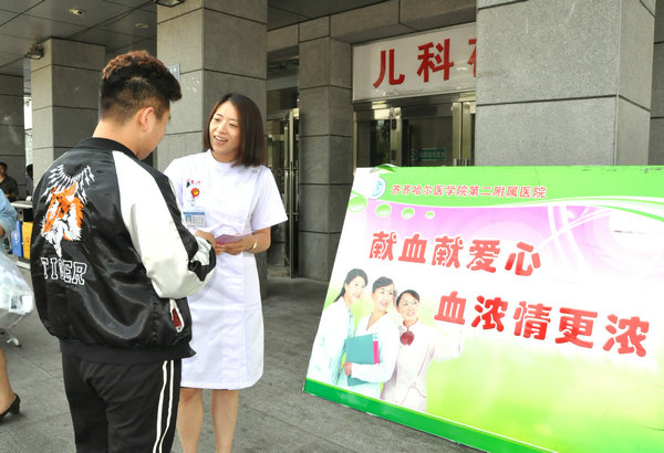 6月14日,附属二院输血科、血液科、医务科、护理部等医护人员10余人,借助宣传板、宣传册、LED屏等媒介在医院门诊楼前开展了世界献血者日宣传活动,提高百姓对献血的正确理解和认识,倡导百姓积极加入到无偿献血队伍中来。应中心血站邀请,附属二院还参加了市中心血站组织的世界献血者日授牌仪式,并被市无偿献血工作委员会授予“无偿献血公益事业爱心单位”。市卫计委和中心血站领导对医院热心公益,积极开展世界献血者日宣传活动给予了充分肯定和好评。