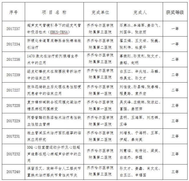 近日,2017年度黑龙江省医疗卫生新技术应用奖评审结果揭晓。学院附属医疗机构获奖取得了历史性突破,获得了一等奖2项,二等奖3项,三等奖5项共计10项奖项。