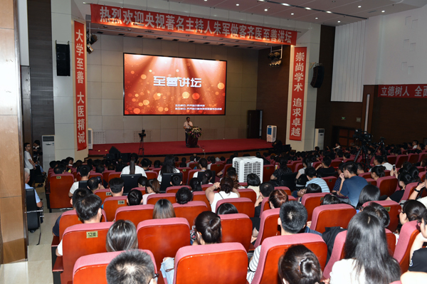 开讲伊始,朱军老师以一个“大”字概括了齐医给他的感受,特别是“大学至善,大医精诚”的校训给朱军老师留下了深刻的印象。随后他以幽默风趣的方式,向现场听众讲述了他从一个微不足道的小人物成长为家喻户晓的央视名嘴的经历。通过朱军的讲述,师生们了解到了名人成功背后的艰辛,也更加明白了爱拼才会赢的道理。朱军老师分享:“当别人把你当回事儿的时候,你千万别把自己当回事儿,当别人都不把你当回事儿的时候,你一定要把自己当回事儿。”他鼓励有梦想、有理想的医学生们去拼搏,努力实现自己的人生价值。朱军老师还在现场设置了互动环节,亲切解答师生的提问,并鼓励齐医学子在医学的道路上,更加坚定地走下去,去造福社会,造福人类,做一个棒棒的中国好医生。