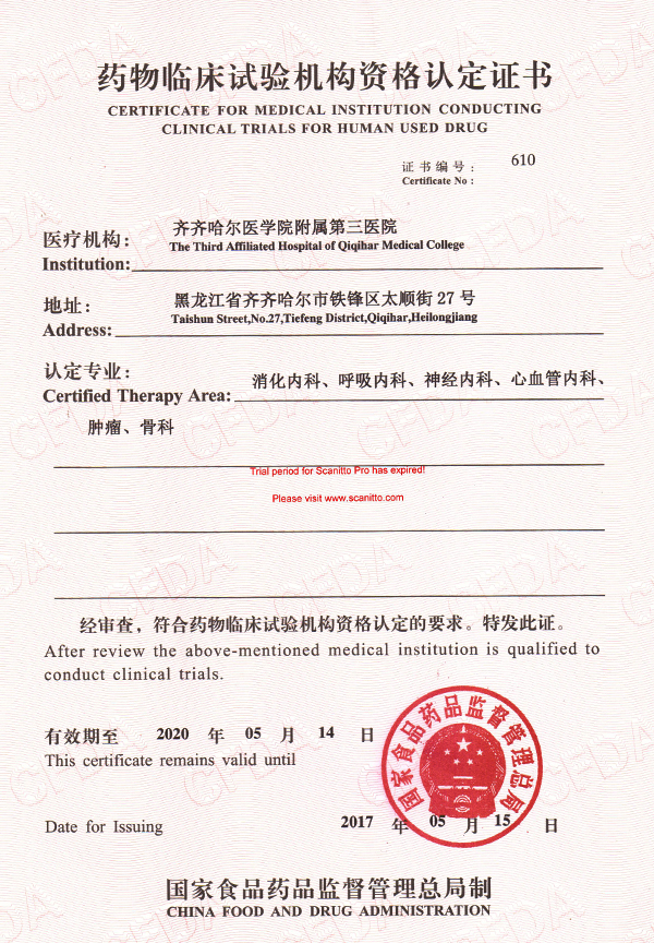2017年5月15日,国家食品药品监督管理总局官网发布第57号公告,根据《中华人民共和国药品管理法》《药物临床试验机构资格认定办法(试行)》,经资料审查和现场检查,认定附属三院具有药物临床试验机构资格,发给《药物临床试验机构资格认定证书》。附属三院申报的6个专业:消化内科、呼吸内科、神经内科、心血管内科、肿瘤科、骨科全部一次性通过国家资格认定,具备承担国内外各类新药的Ⅱ、Ⅲ、Ⅳ期临床试验资格。