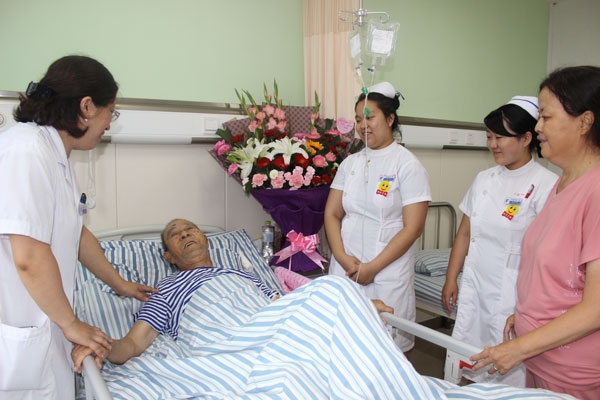 8月1日是中国人民解放军建军90周年纪念日,附属一院消化内科医务人员在科主任郭威、护士长郭健丽的带领下,慰问为多次参加革命战斗的建国前老干部,特殊患者王顺,并为他献上花篮和祝福。
