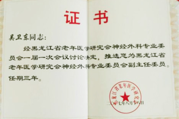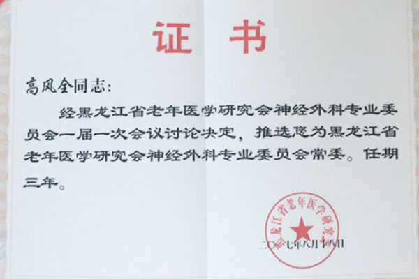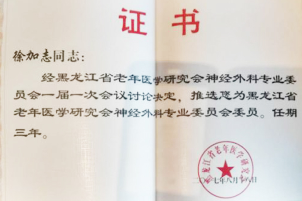 此次大会由黑龙江省老年医学研究会主办,哈尔滨医科大学附属医院承办。省老年神经外科专业委员会主任委员由哈医大王智教授当选,附属三院神经外二科吴卫东主任当选为专委会副主任委员,也是齐齐哈尔市唯一的副主任委员;高风全副主任当选为专委会常委;徐加志任专委会委员。老年神经外科专业委员会的成立为黑龙江省神经外科临床医生及研究人员搭建了新的学术交流平台,拓宽了大家的交流渠道,有助于进一步提升神经外科疾病的诊疗水平及社会影响力。