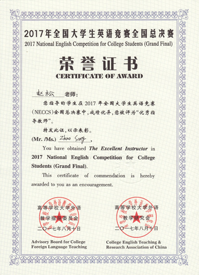本次总决赛由高等学校大学外语教学指导委员会、高等学校大学外语教学研究会主办,由哈尔滨理工大学、天仁报业集团英语辅导报社、考试与评价杂志社共同承办。来自全国230余所高校的近400名大学生组成的28个省级赛区代表队参加了本届全国总决赛。所有参赛选手均是2017年全国大学生英语竞赛省级特等奖及一等奖获奖者,他们代表了我国大学生英语的最高水平。在总决赛期间,选手们共参加了演讲赛、风采赛、辩论赛、英语沙龙、讲座、文化观光等一系列活动,正如专家评委组清华大学Prof.John Olbrich教授在点评时说的那样,“Hard work and opportunity are both necessary for success”(勤奋和机遇都是成功的必要条件),我院选手用自己的努力把握住了这次机会,在赛场上用实力证明了自己。