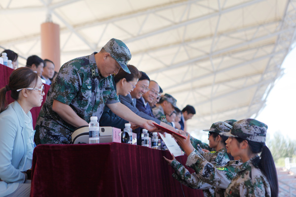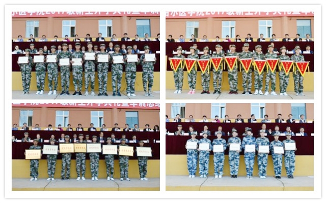 分列式和军训团表演结束后,学院院长顾长虹向承训部队赠送了锦旗,武装部部长尚天歌宣布了军训评比结果。此次军训共评选出“优秀学兵”188人、“优秀学兵寝”56个、“优秀学兵连”8个、“优秀指导员”8人,学院领导和部队领导为获奖人员颁发了奖牌和证书。