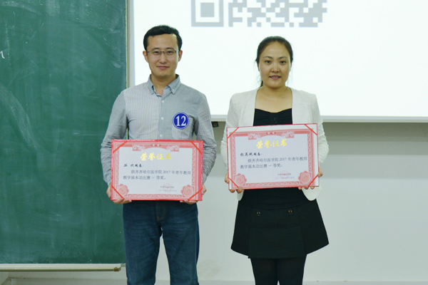 9月14日下午,竞赛组委会组织具有丰富教学经验的教授、教学效果优秀的教师代表以及督导组专家共12人,对15名选手的教案进行了评比。15日全天,参赛选手分别进行了20分钟的现场授课。现场授课环节,参赛青年教师准备精心、设计巧妙,在短短的20分钟内将授课内容、讲解方式、教学方法与手段、自身形象等作了淋漓尽致地展现,他们的课堂表现受到了评委们的一致肯定,赢得了在座评委和现场师生的一次次掌声。经过紧张而激烈的角逐,最终,护理学院张英艳以总分90.5分、药学院丛欢以总分90.42分的好成绩获得一等奖,基础医学院卢长柱、公共卫生学院程宇、附属二院李宝权、病理学院孙玉荣获得二等奖,药学院王明、精神卫生学院杨盼盼、附属第一医院陈春荣、体育教研部马超、附属第三医院庞磊、医学技术学院徐晶、社会科学部霍然、外语教研部鲁楠、医学技术学院王洁获得三等奖。同时,基础医学院卢长柱获得最佳教案奖;通过现场扫描二维码评选,附属第二医院李宝权获得最佳现场表现奖;公共卫生学院程宇获得最佳现代教育技术应用奖。学院工会为获奖选手颁发了获奖证书、奖金和奖品。