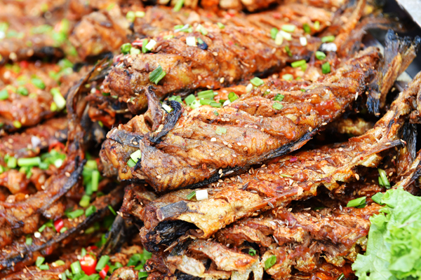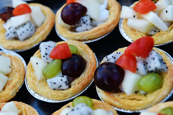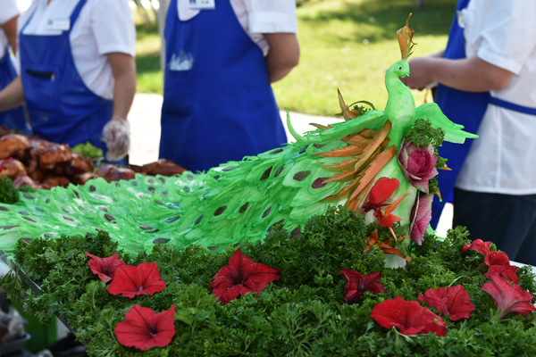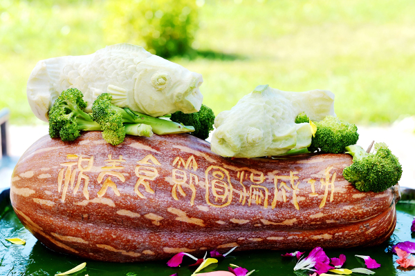 琳琅满目的各色美食散发着诱人的香气。有制作精美的主食,色味俱佳的副食,还有小丸子、关东煮、臭豆腐等小吃纷纷亮相美食节。今年还增加了小龙虾、蚬子等小海鲜,引来众多师生追捧。最吸引人的是展区内栩栩如生的精美雕刻:青、红、胡萝卜化为骄傲的孔雀、西瓜变为粉红玫瑰的花球、南瓜则成为寓意吉庆的双鱼……师生们纷纷举起手机,要将这些巧夺天工的作品长久珍藏起来。