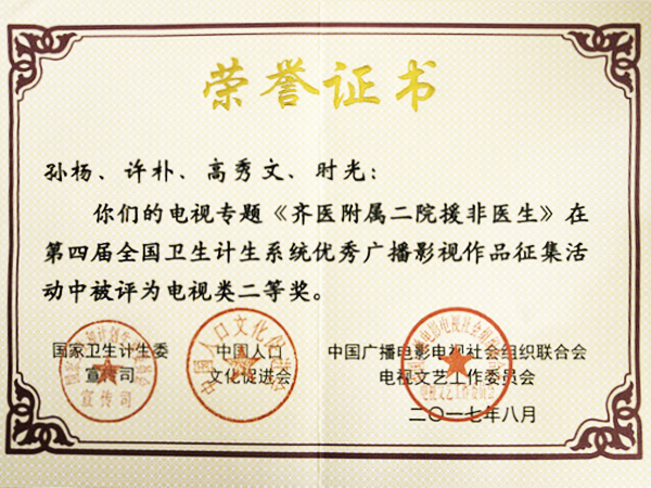 9月18日上午,第四届全国卫生计生系统优秀广播影视作品颁奖典礼在北京举行,附属二院与齐齐哈尔新闻网联合制作的鹤城访谈《齐医附属二院援非医生》荣获电视类二等奖。