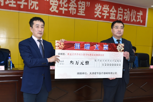 郑东志董事长表示,捐资助学是一件功在当代、利在千秋的事业,取之社会、回报社会是企业的社会责任,也是社会各界的共识。天津爱华医疗器械有限公司今后将携手齐齐哈尔医学院病理学院,共同对学院的优秀学子进行奖学金奖励,他希望同学们能够坚定信念,精于专业、诚于品德,在未来的人生旅途中实现自己的远大理想。