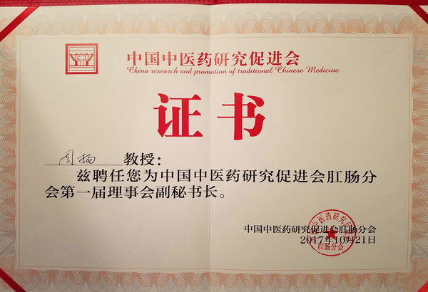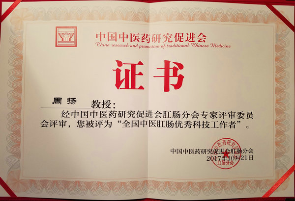 近日,由中国中医药研究促进会肛肠分会主办、中华中医药学会肛肠分会等学会协办的2017年中医肛肠学术国际交流大会在杭州召开。附属二院肛肠科主任周扬教授被授予“全国中医肛肠优秀科技工作者”称号,同时当选中国中医药研究促进会肛肠分会第一届理事会副秘书长。