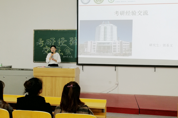 交流会中,学长学姐针对为什么考研、如何考研以及研究生生活作了详细介绍。哈尔滨医科大学生理学研究生郭系文同学向大家介绍了学硕与专硕的区别与利弊,帮助同学们在考研的选择中多方面思考。哈尔滨医科大学病理学研究生高春阳同学则针对如何复习考研,尤其是研究生入学考试中英语科目的复习方法分享了自己的经验。随后,就读于吉林大学普外科专业的李勇同学以考研时间轴为序,逐步为大家介绍了考研由准备到考取的全部细节,帮助大家更好地做出对院校及专业的选择。