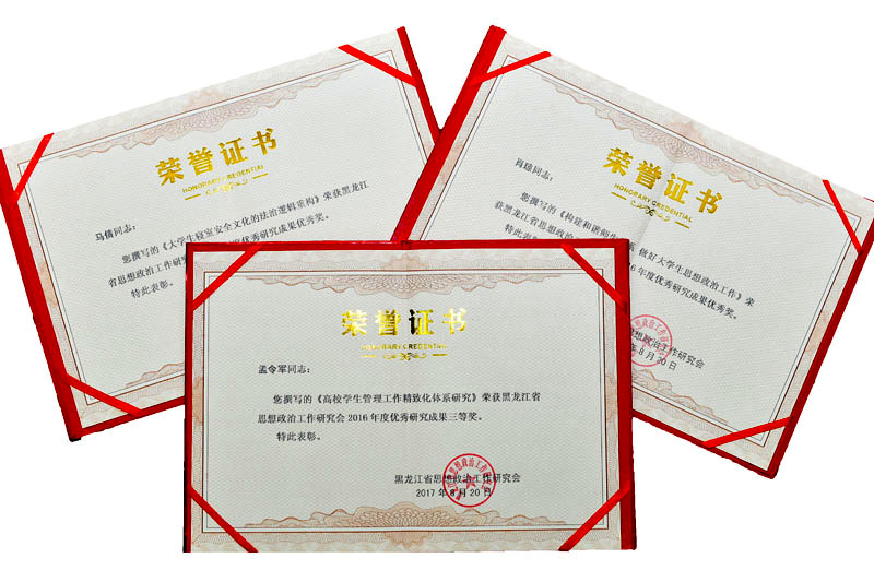 学院在接到《关于开展黑龙江省思想政治工作研究会2016年度优秀研究成果评选工作的通知》后,积极组织老师上交论文进行申报,经过院内初评后,按通知要求向省委高校工委宣传部报送了3篇论文和研究报告参加全省高校系统联评,经过专家审核筛选后推荐到黑龙江省思想政治工作研究会进行最终评审。最终,孟令军撰写的《高校学生管理工作精致化体系研究》荣获三等奖,马倩撰写的《大学生寝室安全文化的法治逻辑重构》、肖琼撰写的《构建和谐师生关系 做好大学生思想政治工作》荣获优秀奖,展示了学院教师在日常思想政治教育实践基础上形成的优秀理论研究成果。