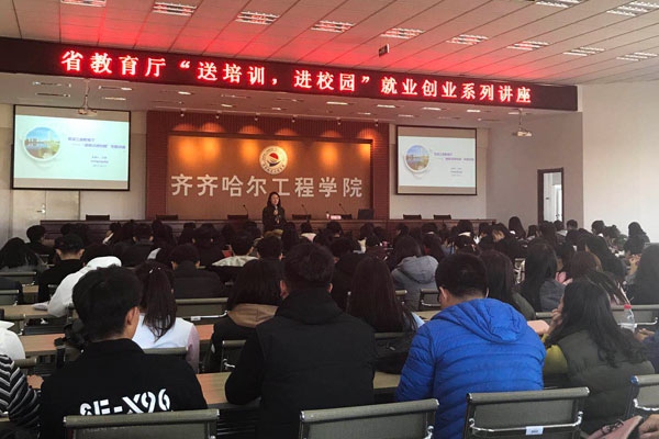 根据省教育厅大学生就业创业指导中心“送培训进校园”活动安排,9月20日至11月20日,学院招生就业处王莹、刘玉玲两名教师作为省就业创业指导专家库专家,为齐市三所高校的学生开展了课程巡讲。