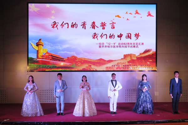 12月6日晚,由团委主办、学生社团联合会承办的“我们的青春誓言,我们的中国梦”纪念一二·九运动82周年文艺汇演暨齐齐哈尔医学院2017年科技节闭幕式在图书行政楼二楼多功能厅举行。