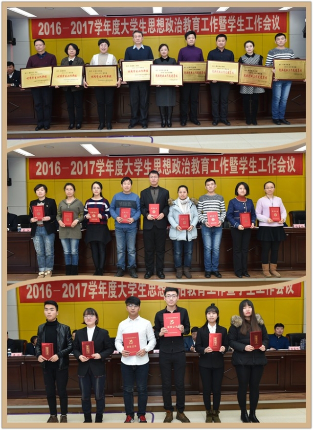会上对2016-2017学年度优秀学生工作单位、就业创业工作先进集体、就业工作先进集体、考研工作先进集体、优秀辅导员、优秀班主任、就业创业工作先进个人及省挑战杯获奖代表和志愿服务省级先进团队代表进行了表彰。