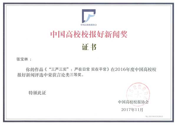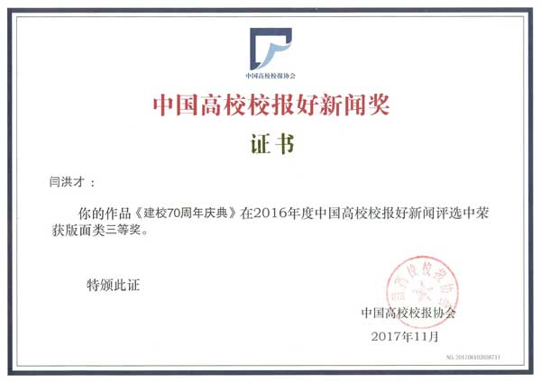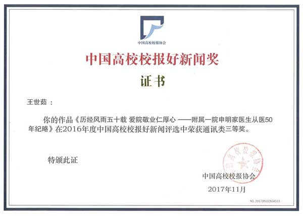 近日,中国高校校报协会好新闻评选结果揭晓,学院有3篇作品获奖。王世茹撰写的《历经风雨五十载 爱院敬业仁厚心——附属一院申明家医生从医50年纪略》荣获通讯类三等奖,张宝林撰写的《“三严三实”:严在日常实在平常》荣获言论类三等奖,闫洪才设计的《建校70周年庆典》荣获版面类三等奖。此次共有来自全国28个省市自治区的644所高校报送的3004篇作品参评。