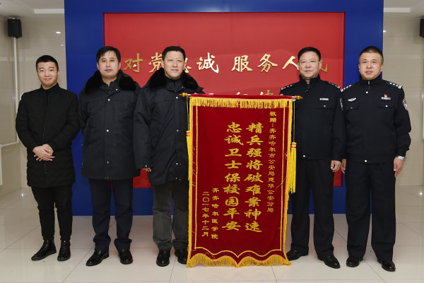 12月11日,学院保卫处处长尚天歌带领相关工作人员,将一面代表全院师生员工诚挚谢意的锦旗送至建华公安分局,感谢公安机关对学院校门部分铸铜艺术字被盗案件的全力侦破、感谢办案民警的辛苦付出、感谢公安机关多年来为维护学院平安稳定做出的积极贡献。同时,双方就进一步加强警校合作进行了沟通交流。