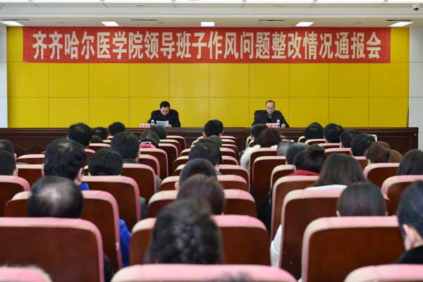 根据省委高校工委《关于召开作风问题整改情况通报会有关事宜的通知》要求,12月12日,学院党委在科技楼五楼报告厅召开了领导班子作风问题整改情况通报会。省高校作风整顿领导小组作风评议组成员、省教育厅高校学生处副调研员刘志达、东北农业大学学生工作处长徐国峰出席会议。学院党委书记刘吉成、工会主席何宪坤、副处级以上领导干部、附属医院领导班子成员、教师和学生代表参加会议,会议由学院副院长王晓星主持。