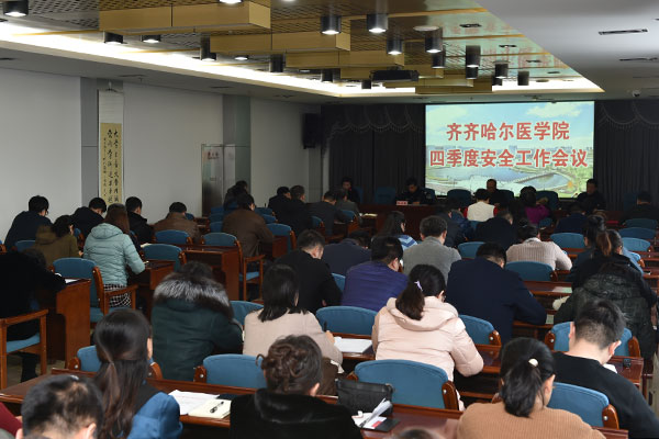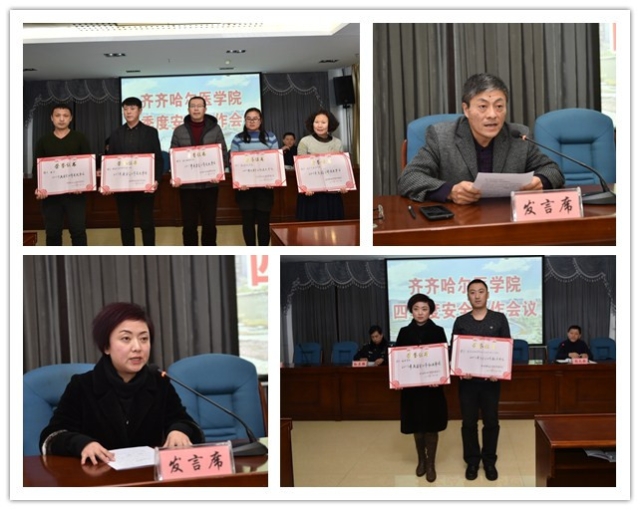 会上,保卫处副处长孙立强传达了《省教育厅关于切实做好教育系统今冬明春学校安全工作的通知》、《省教育厅转发教育部办公厅关于切实做好岁末年初及寒假期间学校安全生产工作的通知》等上级文件精神和《齐齐哈尔医学院关于成立安全生产委员会的通知》文件精神,通报了学院第四季度校园安全接警处警情况、制度建设情况、消防安全工作、毒品预防教育、双重机制建设等工作开展情况,重点通报了2017年安全工作量化考核情况。在全院各单位、部门和广大师生的共同努力下,学院第四季度保持平安稳定。会议对学院2017年安全工作“标兵单位”病理学院,教学实验设备管理中心、实验实训中心(合署),“先进单位” 精神卫生学院、国际交流合作处、现代教育技术中心、工会、附属第一医院进行了表彰。病理学院,教学实验设备管理中心、实验实训中心(合署)等部门负责人从安全责任落实、安全工作管理、日常工作开展、安全风险防控与隐患排查治理双重机制创建等方面进行了安全工作经验交流。
