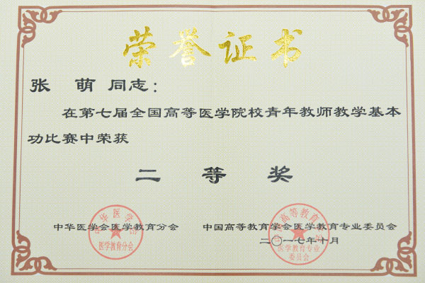 近日,全国第七届医学(医药)院校青年教师教学基本功比赛颁奖仪式在重庆落下帷幕。我院青年教师张萌荣获二等奖。