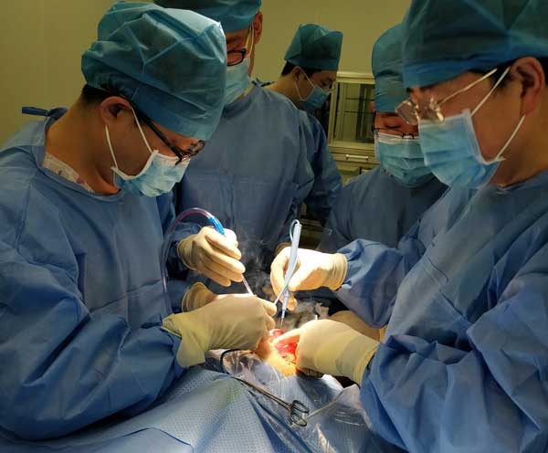 2月11日,麻醉科王海宽主任亲自将病人接进手术室,与主治医师刘立鹏一同为患者进行麻醉、气管插管、深静脉穿刺。9:40手术开始。从开皮、分离、显露、关节置换,到冲洗、止血、引流、皮肤缝合只用了不到30分钟。医生们争分夺秒抢来的是时间,更是生命。因为手术时间越短,患者出现相关危险的概率就越低。