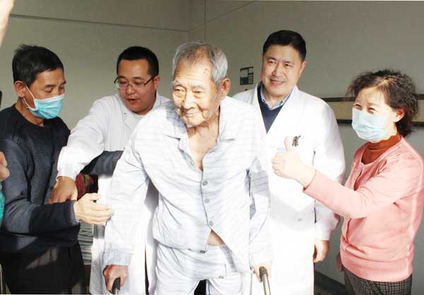 2月13日,病人在重症医学科进行了两天的系统监护,一切参数正常,转回外科病房。护士长郭建玉专门组建护理小组,制定计划并付诸行动,确保了病人从术前到术后能够非常安全地渡过相对危险期。在医护人员的精心治疗和家属的悉心照护下,老人已经能够下床稳移步。