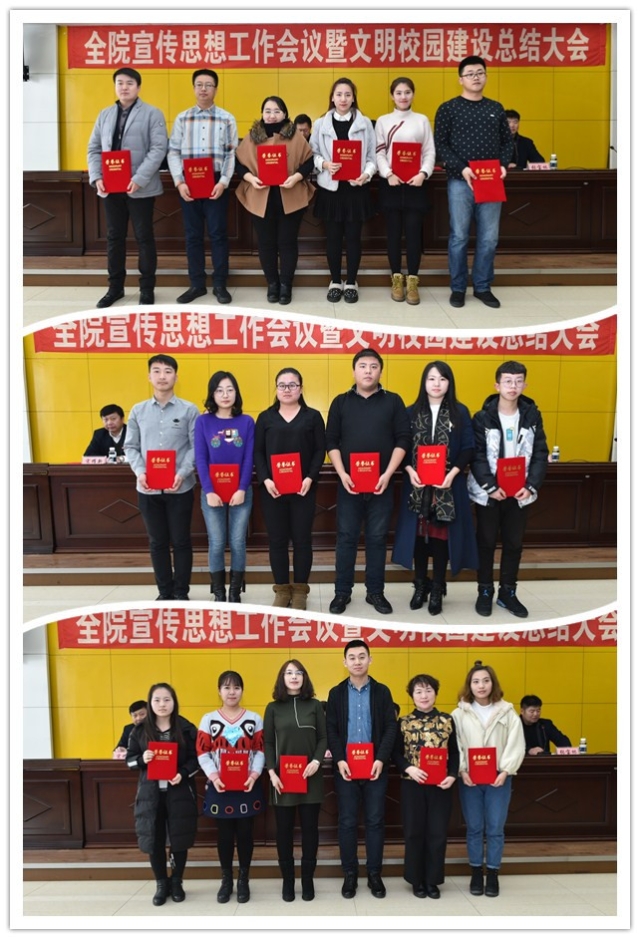 学院党委书记刘吉成发表题为《与党同心 与国同运 让习近平新时代中国特色社会主义思想在齐医落地生根》的讲话。他代表学院党委向获奖的集体和个人表示热烈祝贺,并就进一步做好新形势下全院宣传思想工作和文明校园建设提出四点意见:一是不断加强宣传思想工作,进一步推动习近平新时代中国特色社会主义思想落到实处;二是提高政治站位,进一步建设和管理好意识形态工作的宣传思想文化阵地;三是强化新闻舆论引导,进一步凝聚助推齐医振兴发展的新动力;四是培育和践行社会主义核心价值观,进一步彰显文明校园建设新气象。他强调,作为高等教育的建设者,广大教职员工要以昂扬向上的精神状态和求真务实的工作作风,乘势而上、顺势而为、应势而动,不断开创新局面,实现新发展,步入新境界,为实现“齐医梦”、“中国梦”做出新的更大的贡献!