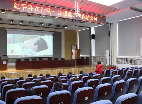 3月20日,附属一院神经内四科组织红手环志愿活动走进鑫三星保洁公司,为近百名保洁人员服务。