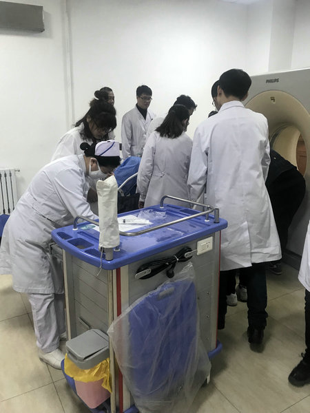救援力量第一时间集结在CT诊断科,紧急关头迅速启动了救治应急预案,心肺复苏、氧气吸入、建立静脉通道、输注抢救药物、清理口腔异物……