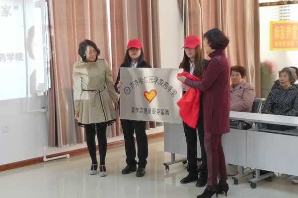 药学院党委副书记、副院长韩翠艳与湖畔社区主任石秀奇为青年志愿者服务基地揭牌