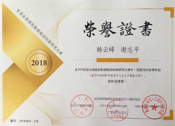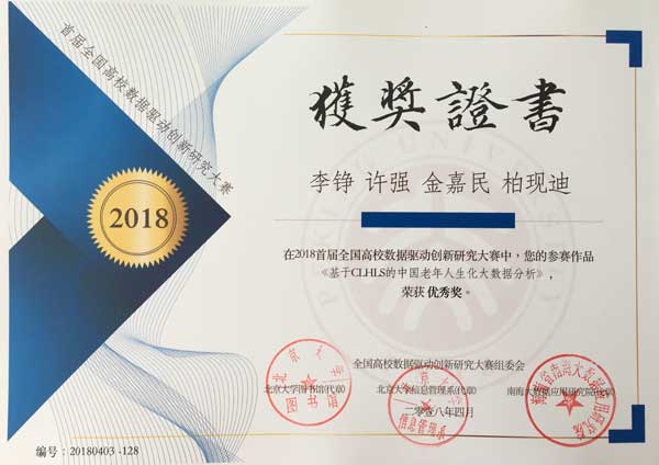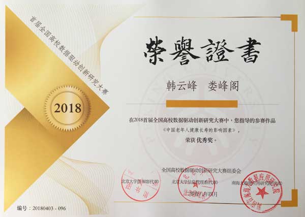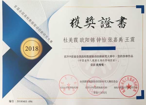本次大赛由国家信息中心大数据发展部、北京市信息资源管理中心作为行业指导单位,北京大学图书馆、北京大学信息管理系、南海大数据应用研究院联合主办,旨在通过比赛推动各学科领域学子基于数据进行创新研究,助力国家大数据发展战略,提高开放科学、开放数据意识,促进研究数据的管理、保存和开放共享。来自全国163所高校的594支队伍参加比赛。学院公共卫生学院2014级预防医学专业许强、李铮、金嘉民、王震、杜美霞、钟怡、张嘉禹、欧阳锦等同学组成两支参赛团队,在韩云峰老师的指导下,携项目《基于CLHLS的中国老年人生化大数据分析》、《中国老年人健康长寿的影响因素》参赛,双双荣获优秀奖。