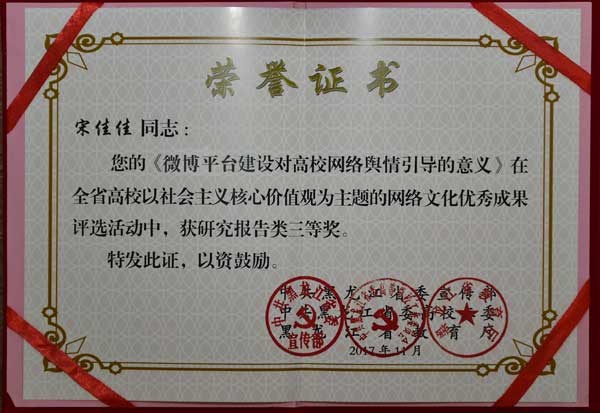 近日,全省首届以社会主义核心价值观为主题的高校网络文化优秀成果评选结果揭晓,学院宋佳佳老师撰写的《微博平台建设对高校网络舆情引导的意义》荣获研究报告类三等奖。