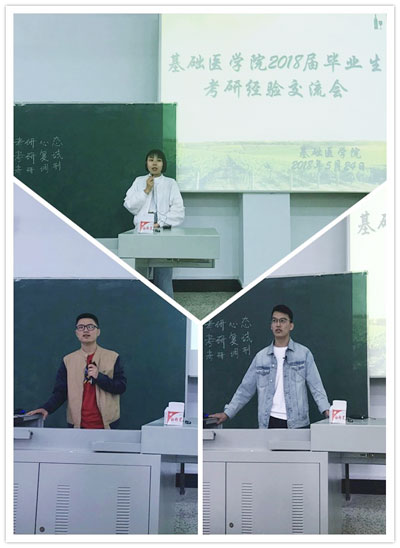5月24日,基础医学院在教学主楼北区201教室召开了2018届毕业生考研经验交流会。来自临床医学麻醉专业方向的鞠洪远、孙莹、吕玉林三位考取硕士研究生的学生代表在会上了做了精彩汇报。各年级在校生积极参加了此次经验交流会。