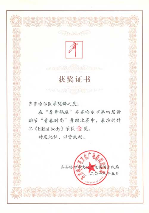 近日,“春舞鹤城”齐齐哈尔市第四届舞蹈节青春时尚舞蹈比赛在市工人文化宫举行。学院舞度街舞社团代表学院参加比赛,表演的作品《bikini body》荣获金奖,同时,学院团委荣获优秀组织奖。