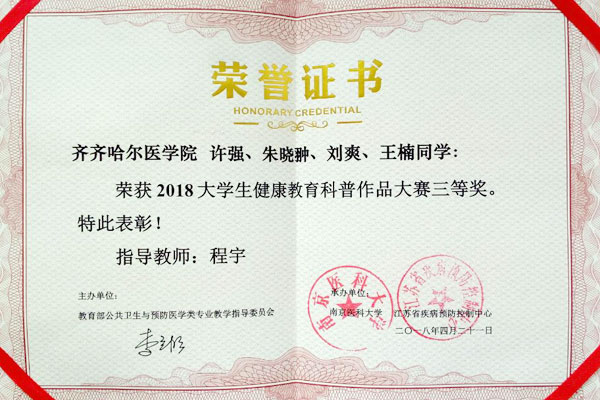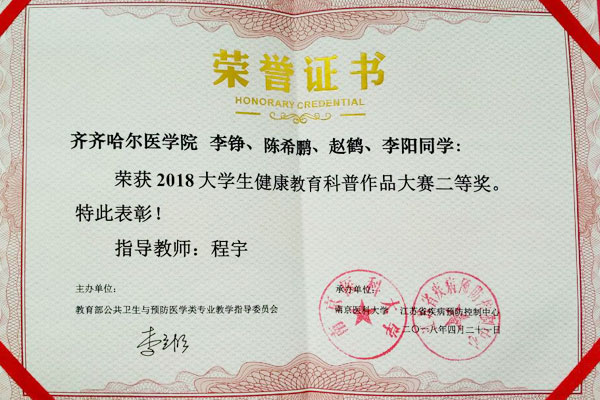 今年4月,由教育部公共卫生与预防医学类专业教学指导委员会主办,南京医科大学和江苏省疾病预防控制中心联合承办的“2018年大学生健康教育科普作品大赛”在南京医科大学开赛,全国60余所医学院校参赛。由学院公共卫生学院程宇老师指导、推荐的两件作品《防止颈椎病 从行为改变开始》、《坦白》从100余件参赛作品中脱颖而出,分别荣获国家级二等奖和三等奖。