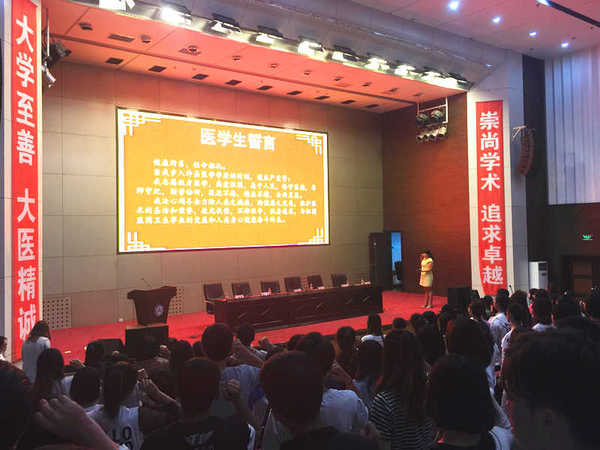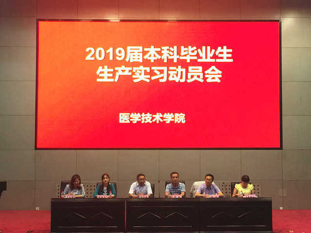 2018年6月20日下午16:00,医学技术学院2019届毕业生生产实习动员培训大会在图书行政楼多功能厅举行,学院党委书记杨泰、院长郭金城、副书记张浩、副院长张春晶出席了本次动员会。